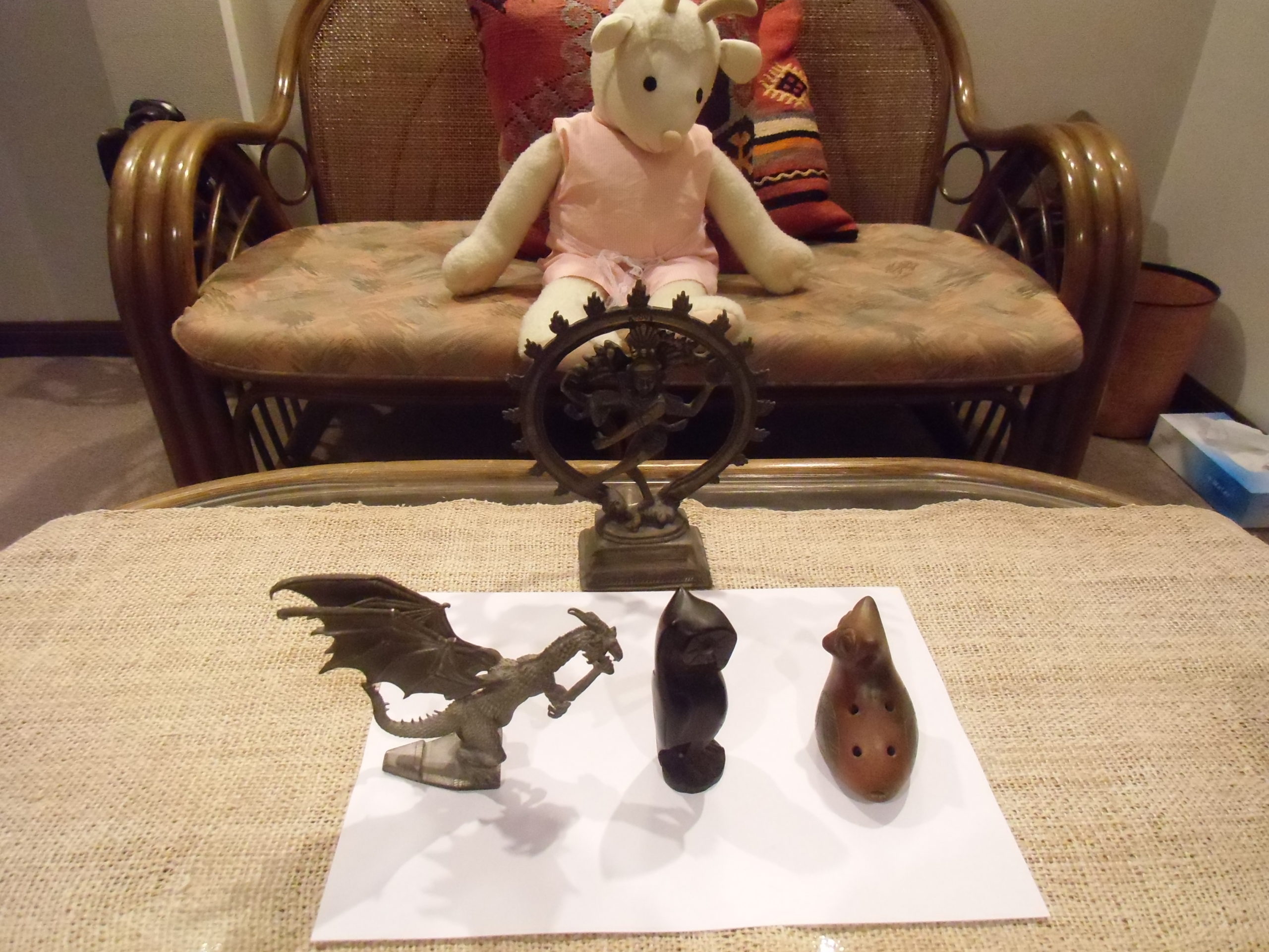 ある人の厳しい倫理観を内在化した外面と、外面によって監視される内面を、何でもお見通しで、なんでもできる力をもち慈悲深くみているトランスパーソナル的存在を、シバ神(慈悲不快超個的存在)とし、シバ神が、ドラゴン(厳しい倫理観)、フクロウ(外面)、オカリナ(内面)を見守っているところを象徴的に表現する:左写真